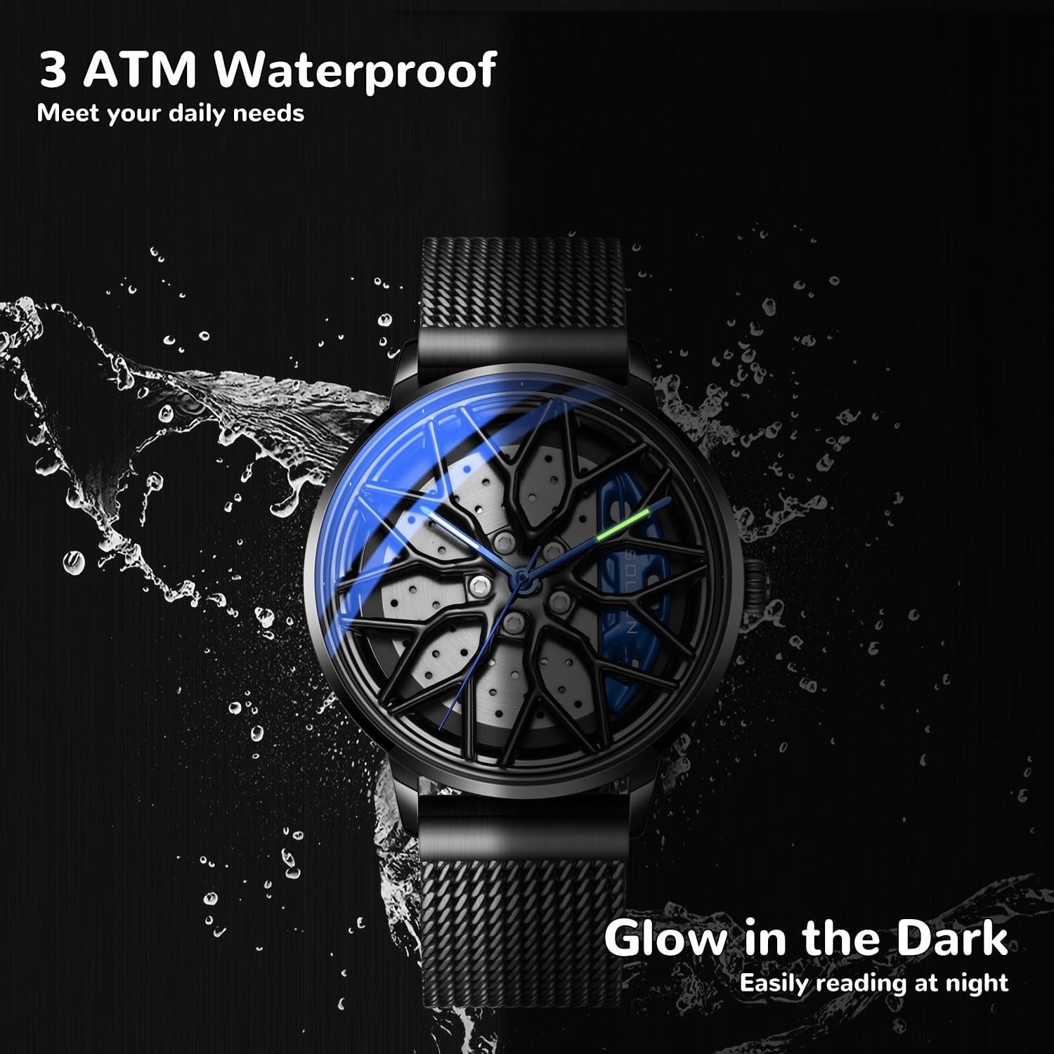 SOLLEN Car Watches for Men, Spinning Wheel Rim Watch, Casual Blue